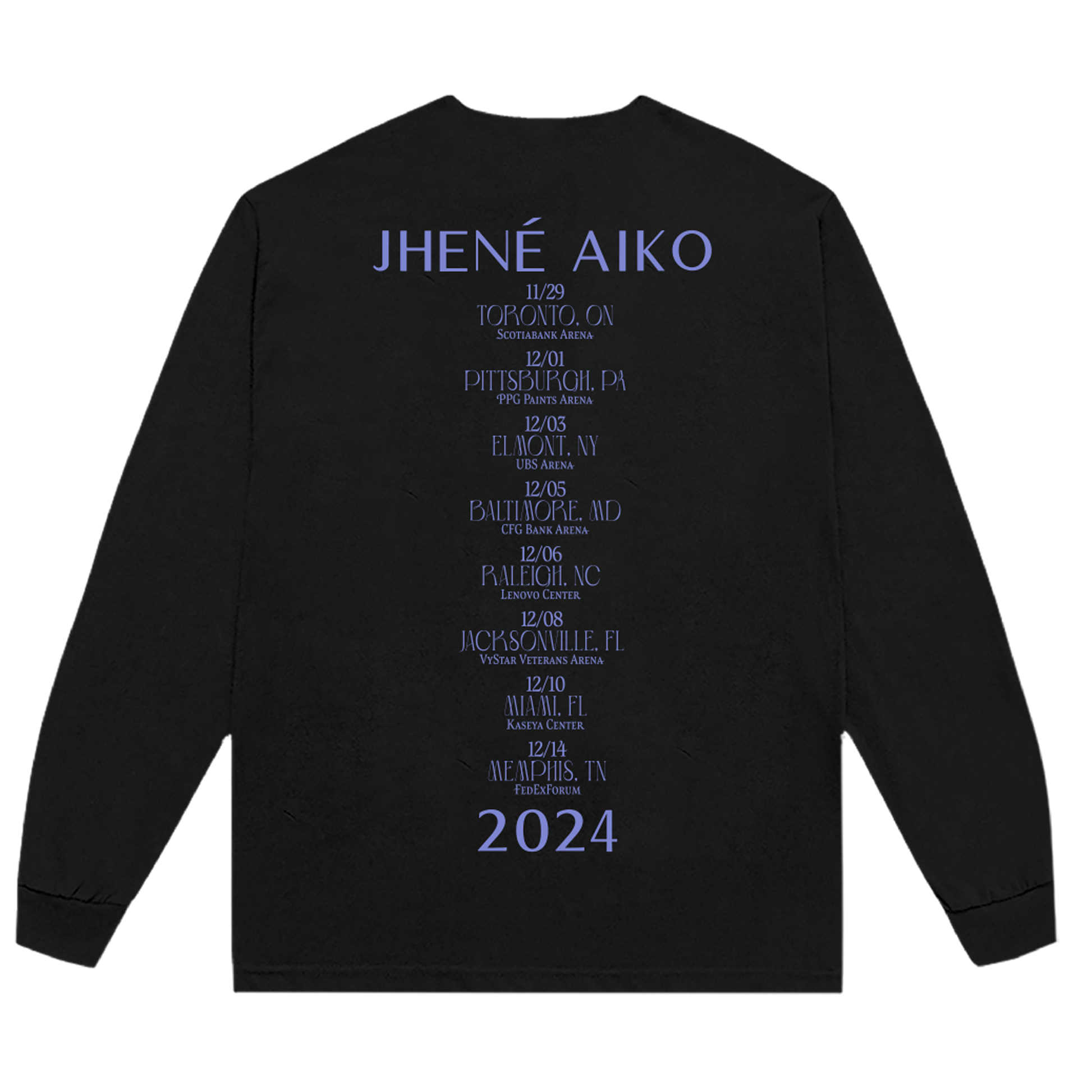 Black Magic Hour Tour long sleeve with Jhene Aiko's face printed on the front and tour dates on the back.